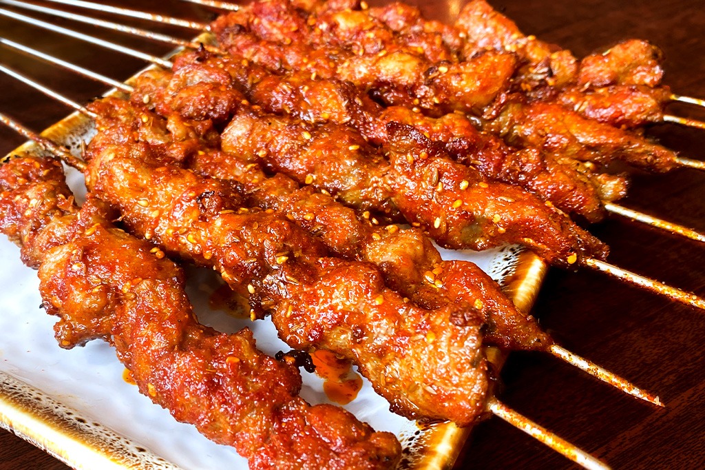 豚肉に香ばしさを引き出すスパイスをかけたエスニック風の串焼きです。